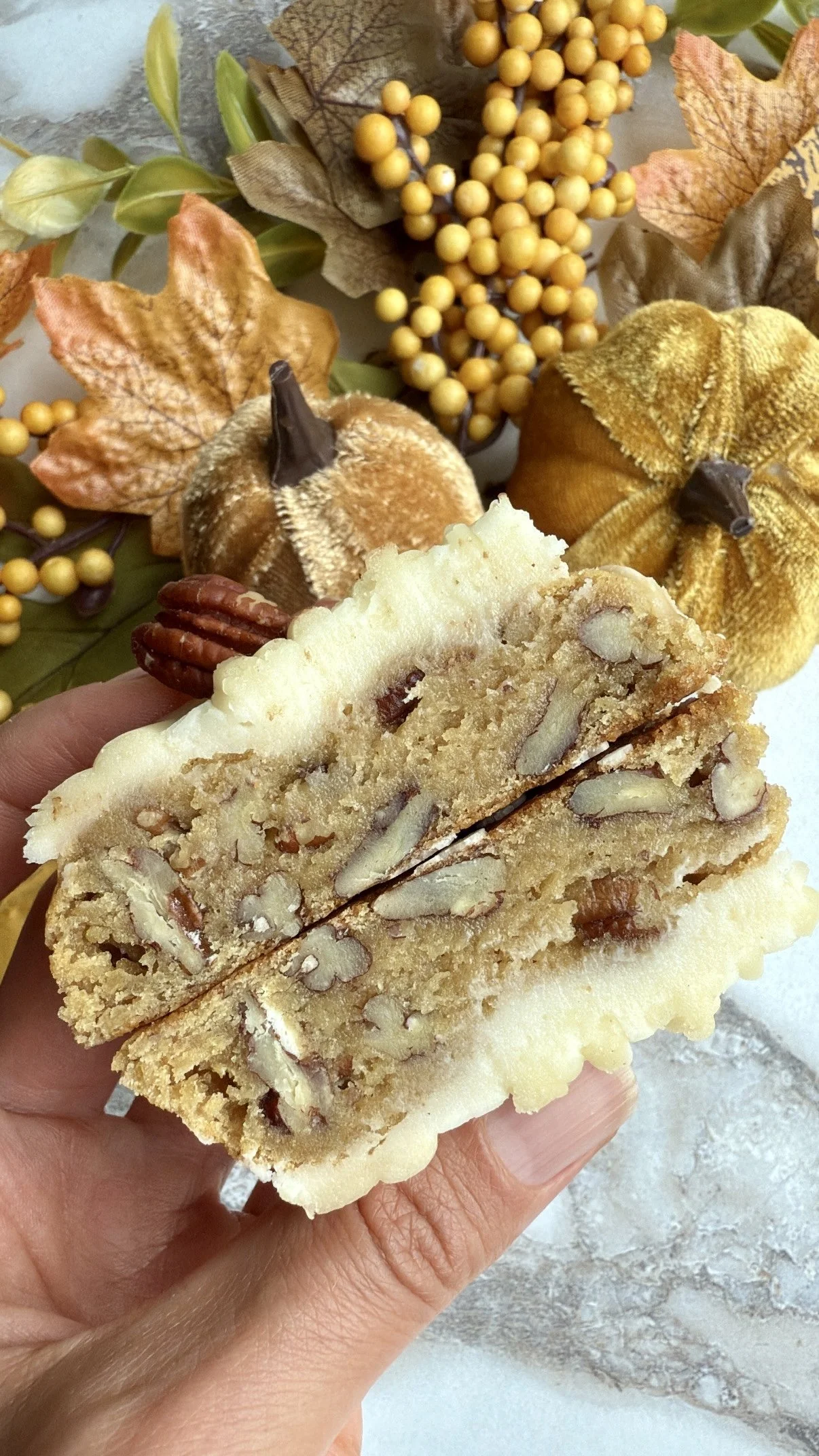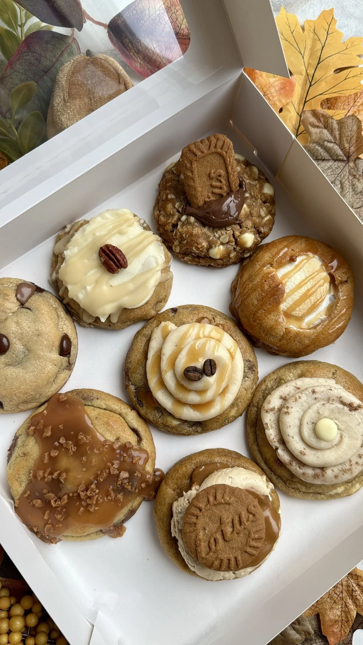 Frosted Maple Pecan Cookie (a brown sugar maple pecan cookie topped with brown butter cream cheese frosting and a maple glaze drizzle)