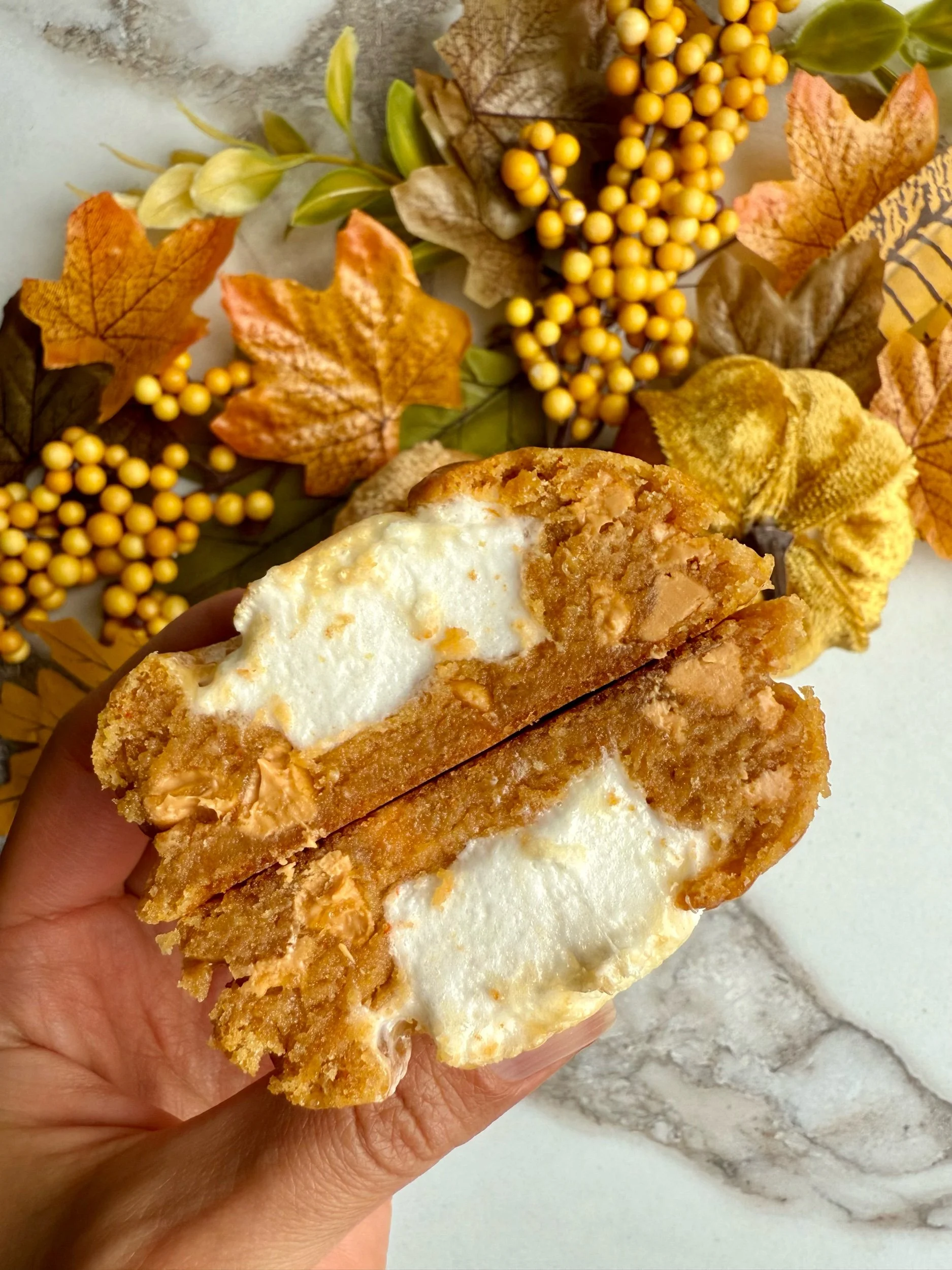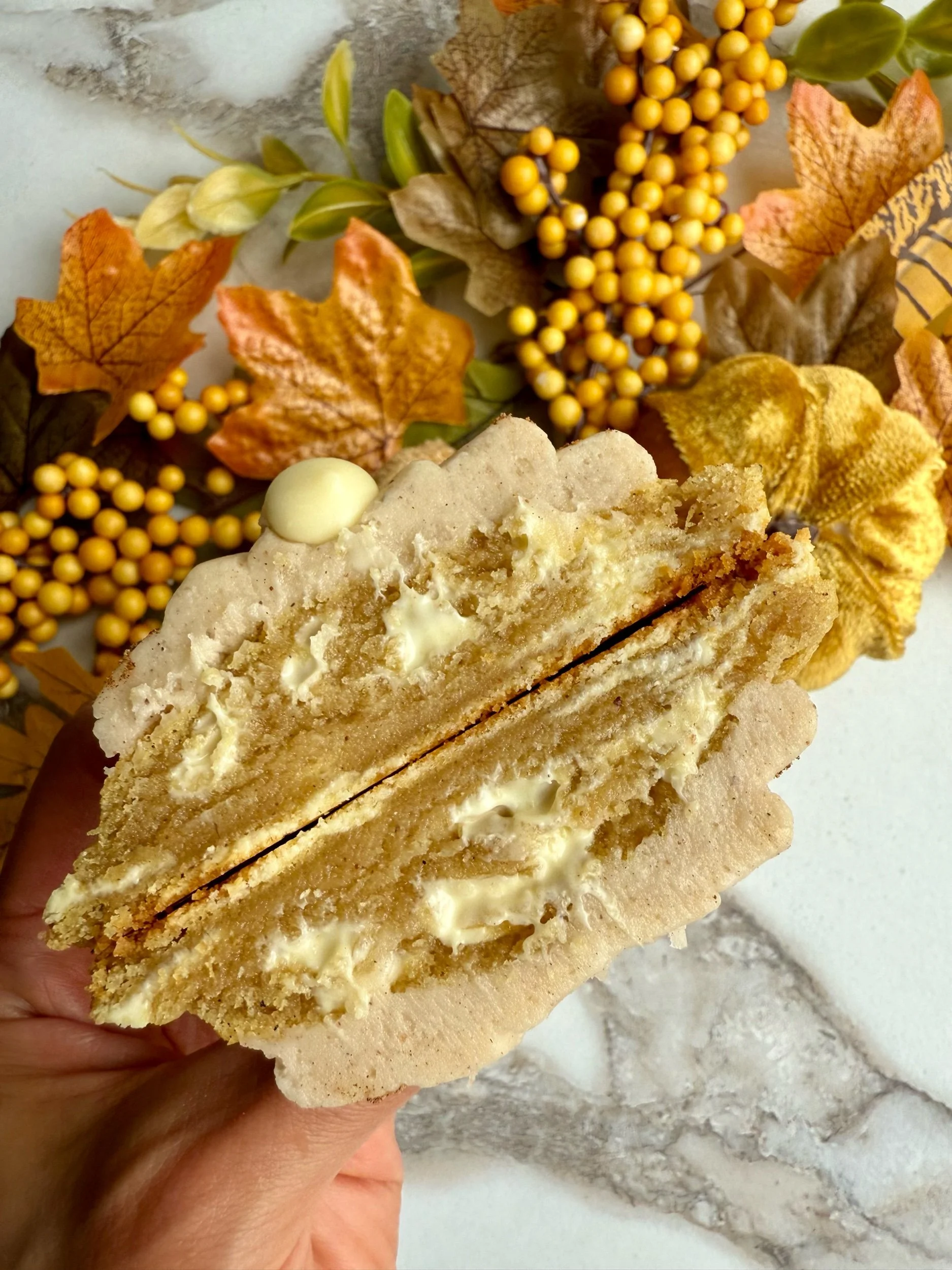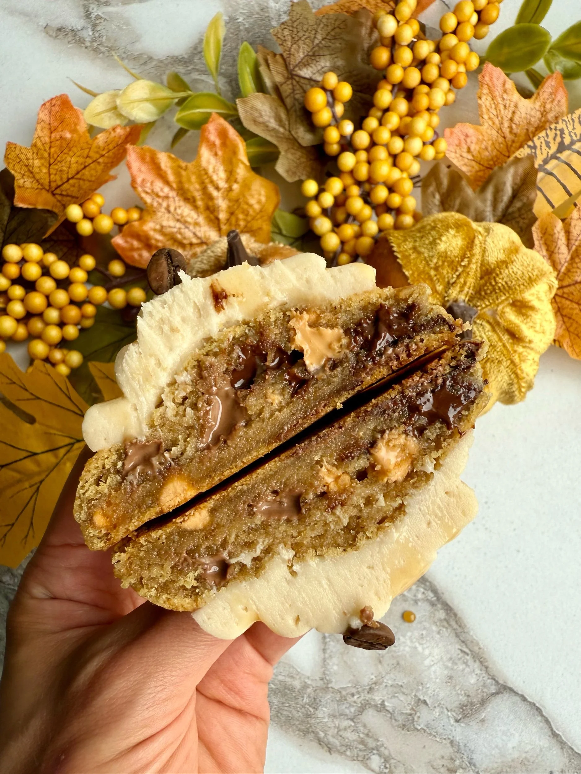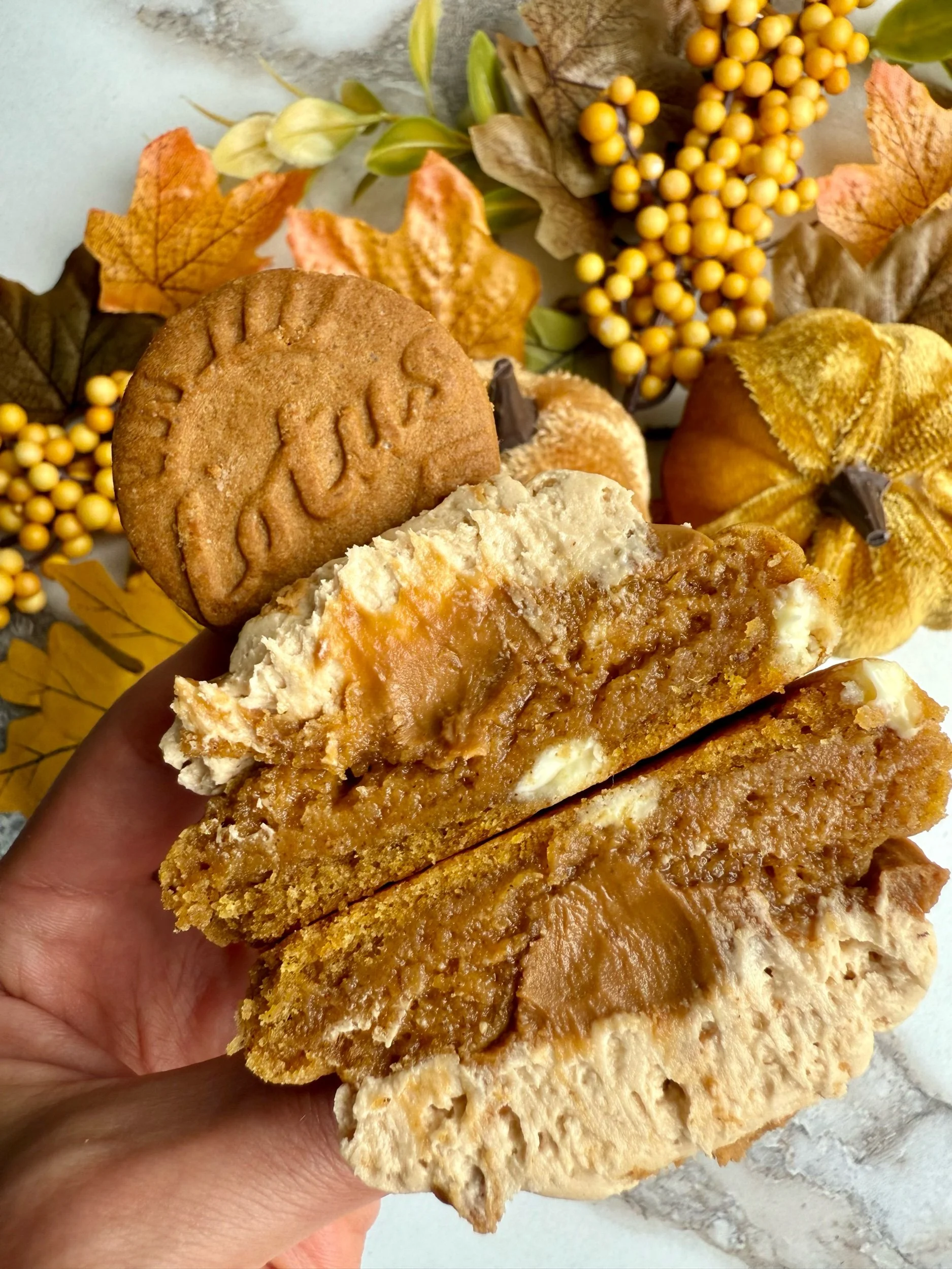 Biscoff Pumpkin Cake Cookie (a soft baked pumpkin spice cookie topped with Biscoff buttercream and a Biscoff centre)