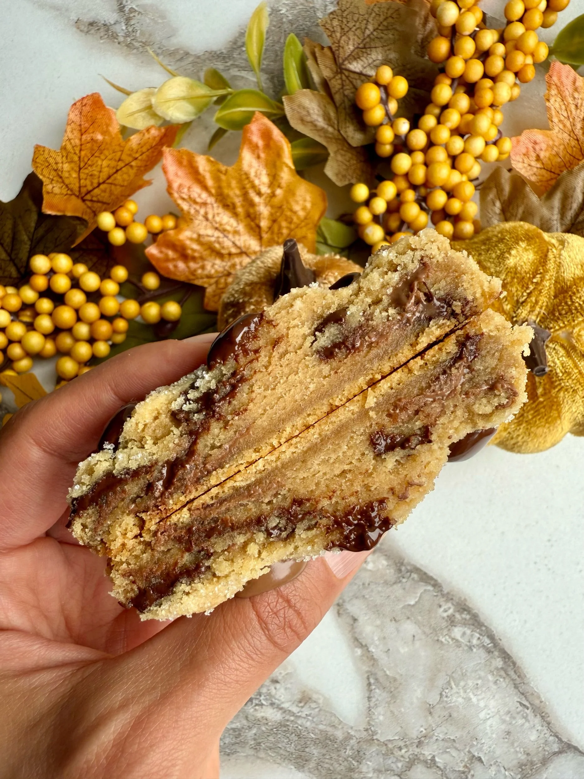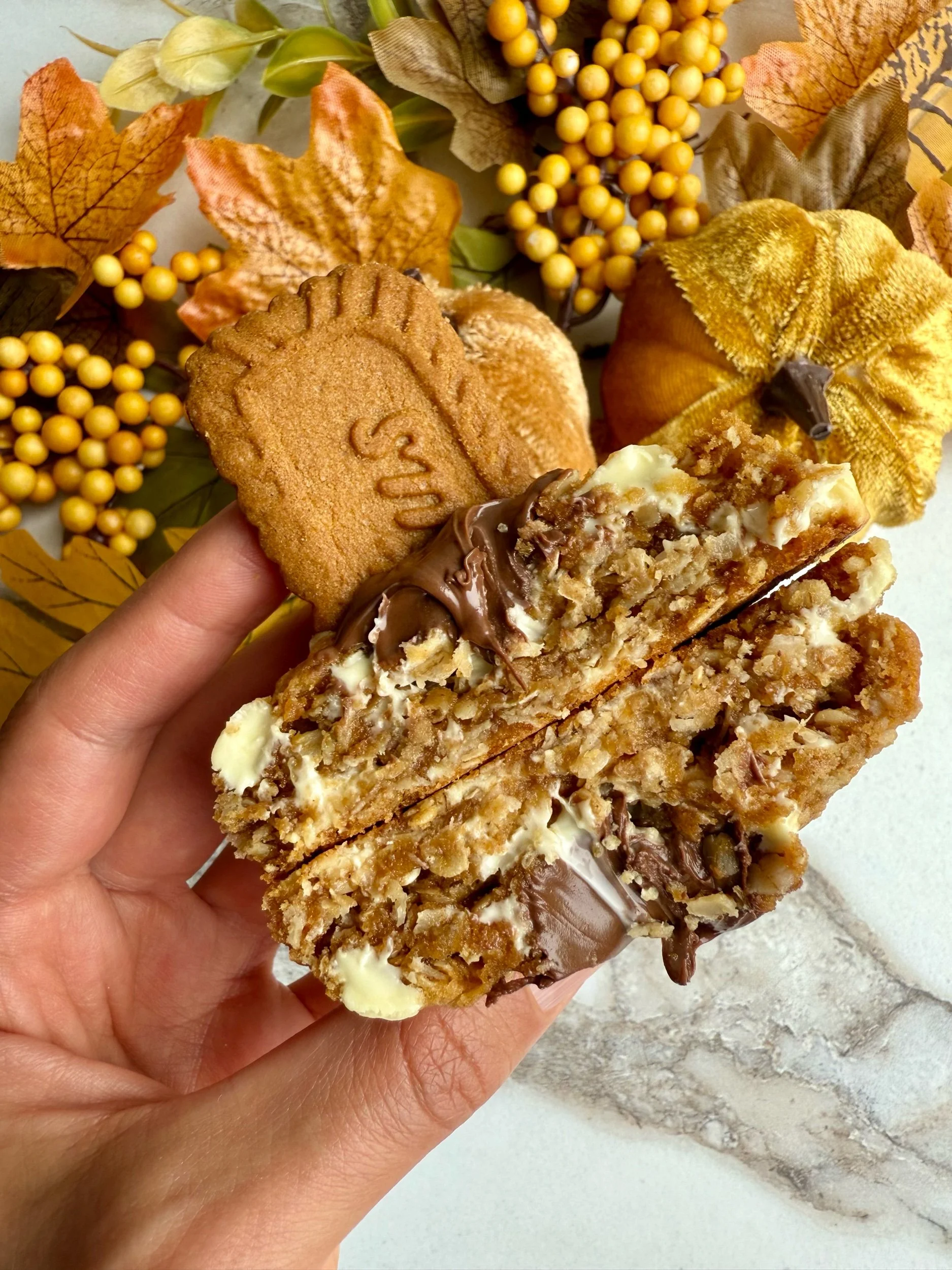 Nutella Biscoff White Chocolate Oatmeal (a biscoff oatmeal white chocolate cookie with a Nutella centre)